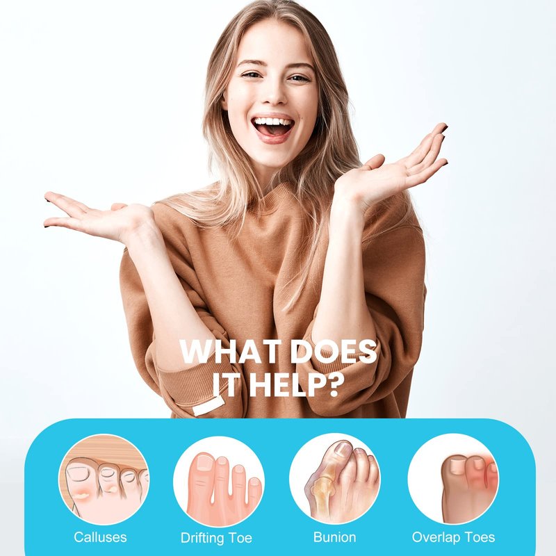 - 【Pain Relief】Double loops bunion separator can separate toes, relieve bunion pain, correct overlapping toe, realign toes to prevent toes from extrusion and friction. Toe corrector prevents the big toe moving inwards, towards the other toes.