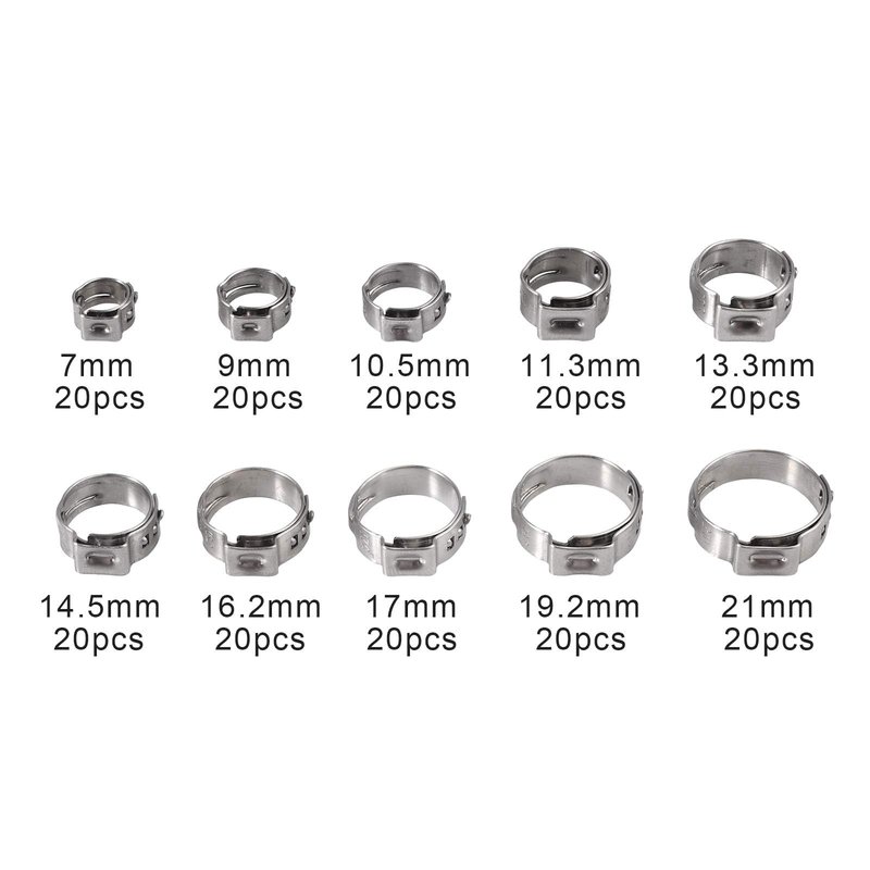 Proster 200pcs Ear Clamps Stainless Steel Hose Clamp Clip 5.8-7mm, 7.3-9mm, 8.8-10.5mm, 9.6-11.3mm, 10.8-13.3mm, 12-14.5mm, 13.5-16.2mm, 14.5-17mm, 16-19.2mm, 17.8-21.0mm