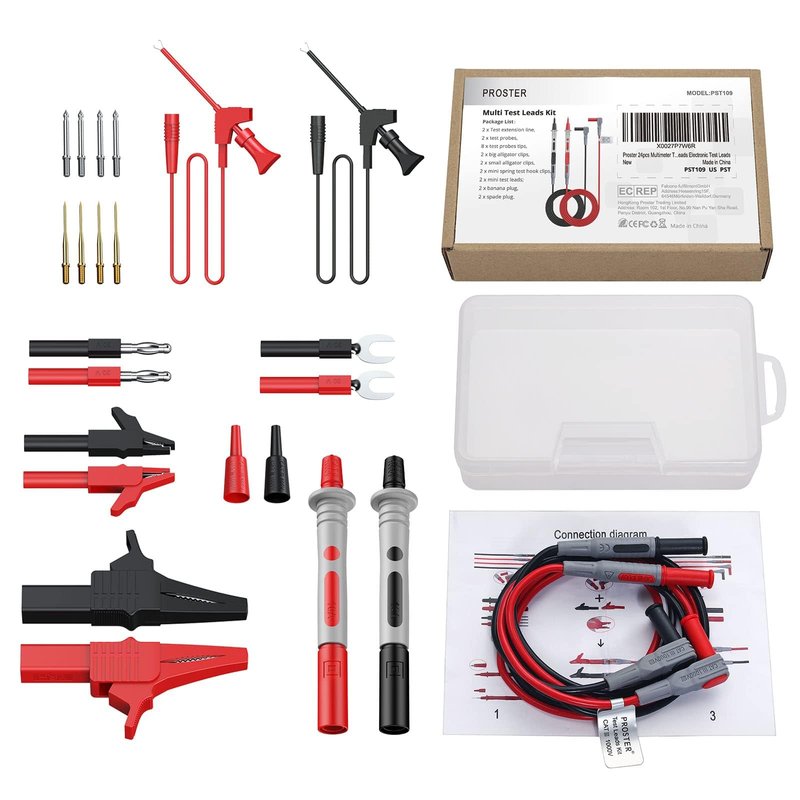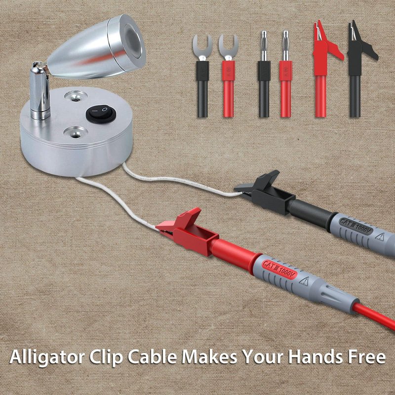 - 【MULTIMETER TEST LEAD KIT】2 x Mini Spring Test Hook Clips, 2 x Mini Test Leads; 2 x Small Alligator Clips, 2 x Alligator Clips, 8 x Special Tip Probes , 2 x Test Extension Line, 2 x Spade Plug, 2 x Test Probes, 2 x Probes, suitable for multimeter / clamp meter to expand testing capability and flexibility for School, Lab, Electrician, Etc.