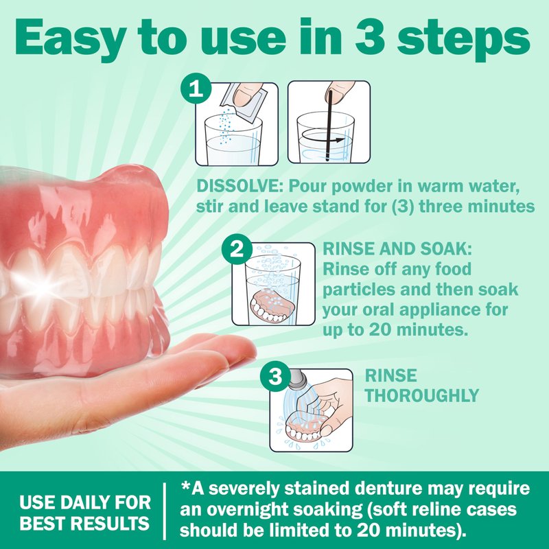 - Easy to use — Stir one mint flavored cleaning crystals packet in a container of warm water and allow the solution to dissolve for three minutes; soak dental appliance for 20 minutes and then rinse under running water. Use a brush and ultrasonic bath for increased cleaning efficiency.