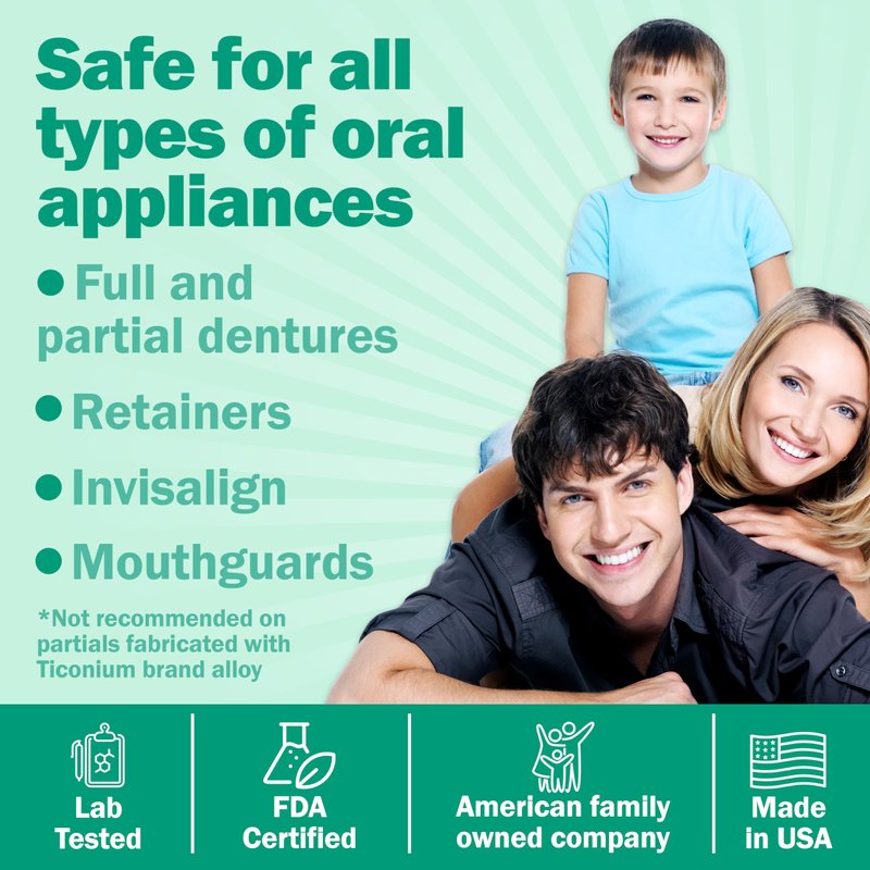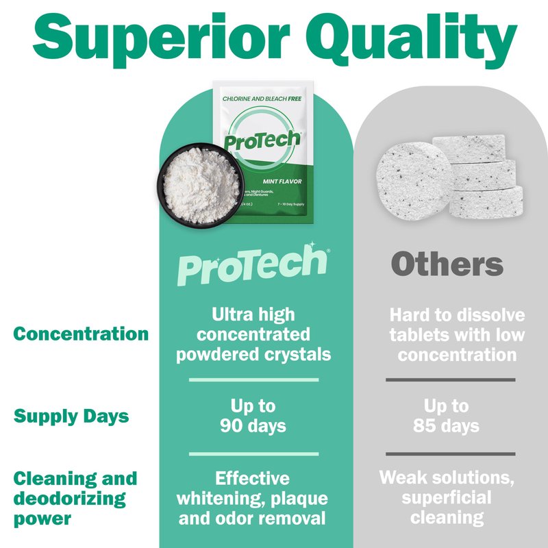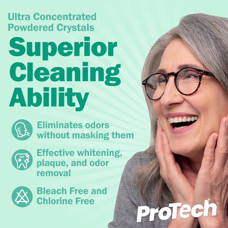 - Formulated to Clean All Dental Appliances — Dentures, clear aligners, retainers, mouth guards and night guards. Protech is made in the USA with a high concentration formula that is both safe and effective in cleaning oral devices and maintaining their longevity.