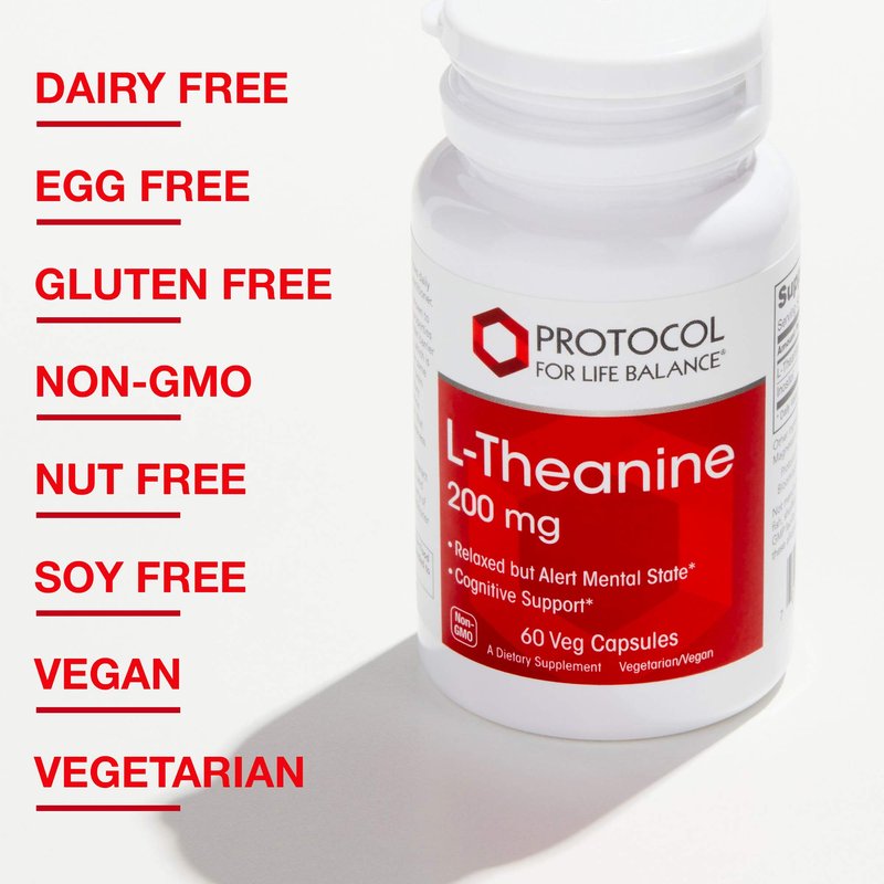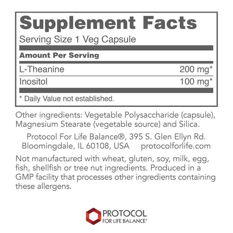 Protocol L-Theanine 200mg - for Brain Health, Relaxed but Alert Mental State & Normal Dopamine & GABA Release* - Calming like Green Tea* - with Inositol - Made without Gluten, Non-GMO - 60 Veg Caps