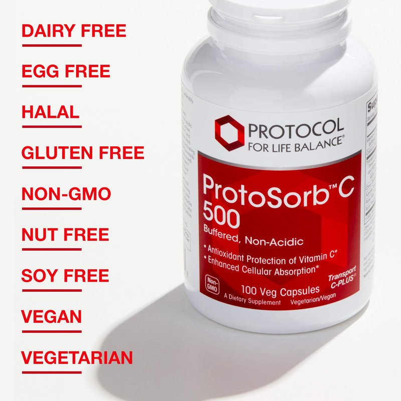 ProtoSorb C 500 is free from dairy, eggs, nuts, and soy, and is Halal and Kosher certified. It's also non-GMO, made without gluten, and vegan-friendly. Take 1 capsule 1 to 3 times daily, preferably with food, or as directed by your healthcare practitioner.