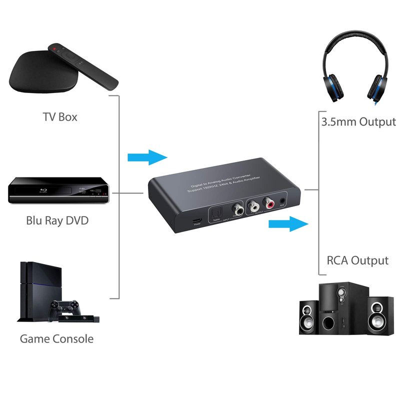 - 【192kHz DAC Converter with IR Remote】Coaxial/ Toslink/ Optical to Analog L/R Audio with 3.5mm Audio Output to Your Headphone / Headphone Amplifier, for Home or Professional Audio Switching.