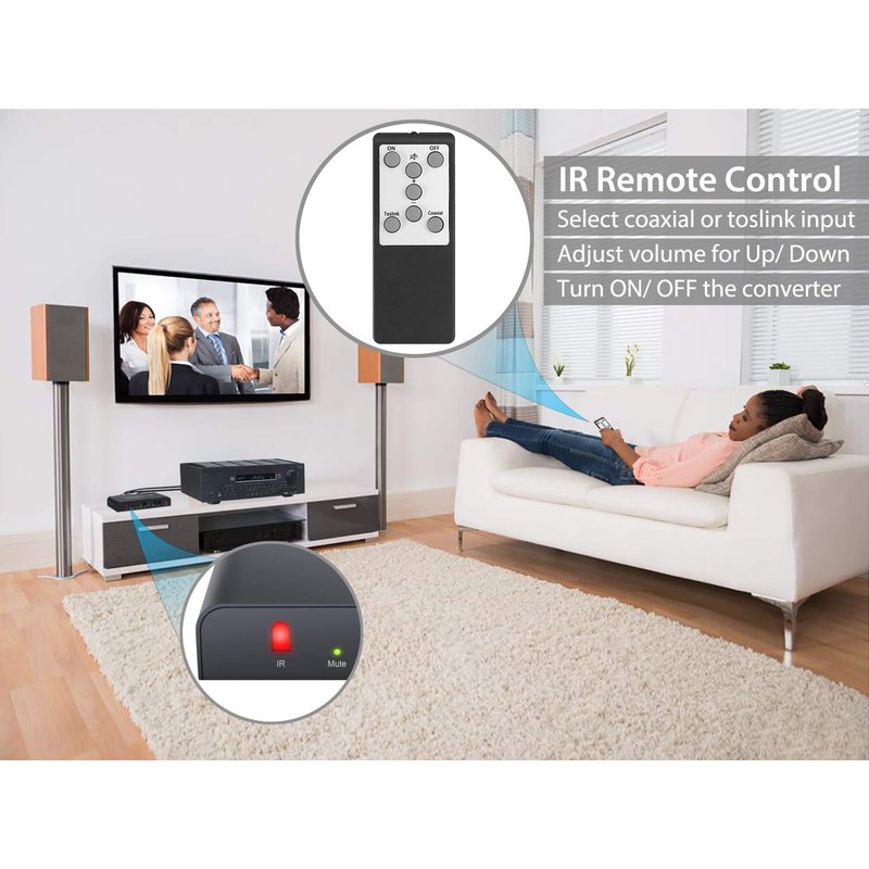 - 【IR Wireless Remoote Control】Easily Adjust Volume/ Choose Coaxial or Toslink Input/ Mute/ Power ON or OFF by Remote Without Leaving Your sofa.【Note:Please Face the Remote to IR Indicator on Converter】
