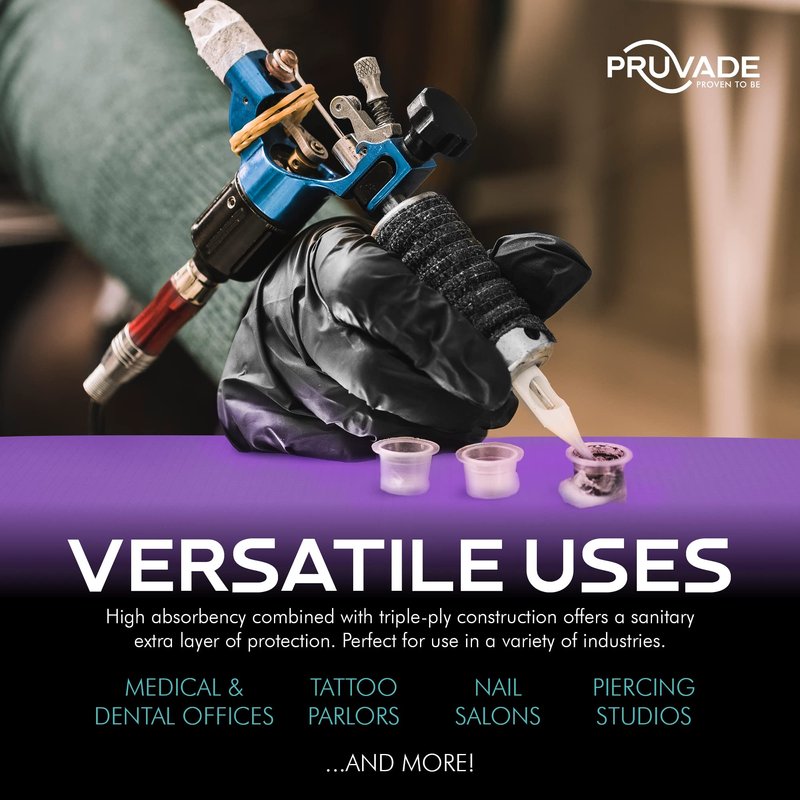 - RECOMMENDED TATTOO SUPPLIES - Recommended by tattoo parlors and professional piercing studios, these tattoo bibs make impressive tattoo tray table covers. Quickly soak up excess ink and prevent dark inks from seeping through and staining the workbench.