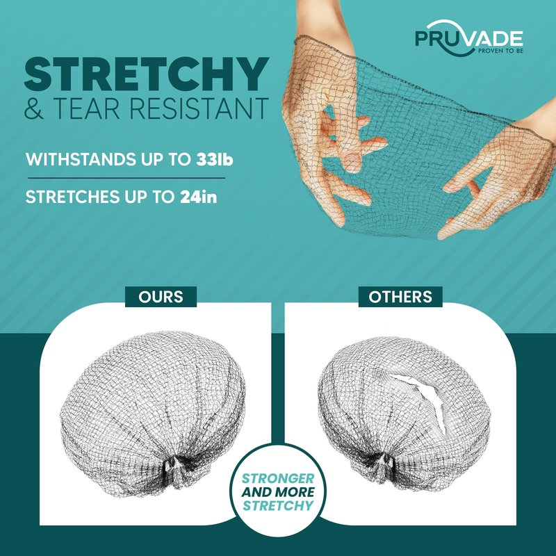 Always look professional and hygienic with Pruvade breathable elastic hair nets. Keep virtually any style hair looking well kept and presentable at the workplace, while dancing, playing sports or during other intense activities. Our superior silky soft material will leave you forgetting you even have a hairnet in the first place!