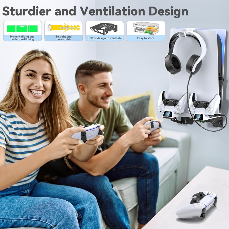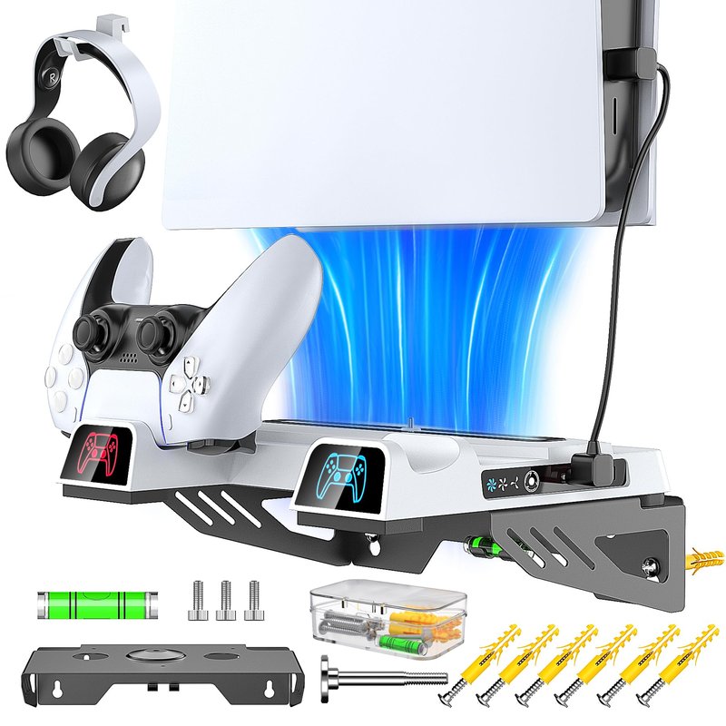 - 🆒 【All-in-one PS5 Wall Mount】PS5 wall mount with charging and cooling fan is designed for both PS5 Disc and Digital Versions, 📌NOT for PS5 Slim Versions, which features efficient cooling system, dual controller charger, headset holder and extra USB port for charging other devices. As PS5 controller charger, it can fully charge dual PS5 remote in 2.5-3 hours, getting power from ps5 console or wall adapter. Blue for fully charged and organe for charging that you easily know the charging status.