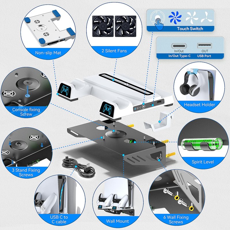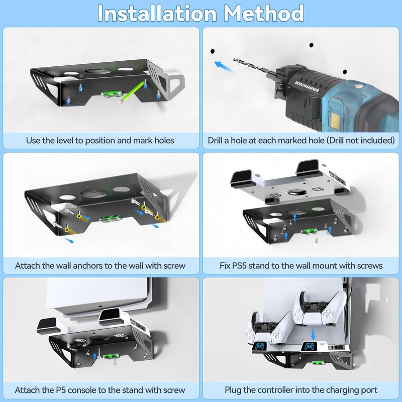- 🆒 【Complete Installation Accessories】In addition to the stable metal material, PS5 mount kit with cooling fan and controller charging station includes spirit level and 6 wall anchor screws. With spirit level, it can avoid tilting and better positioning to mark holes that make it more convenient during installation. Please noted that it need drill a hole, but drill is not included.