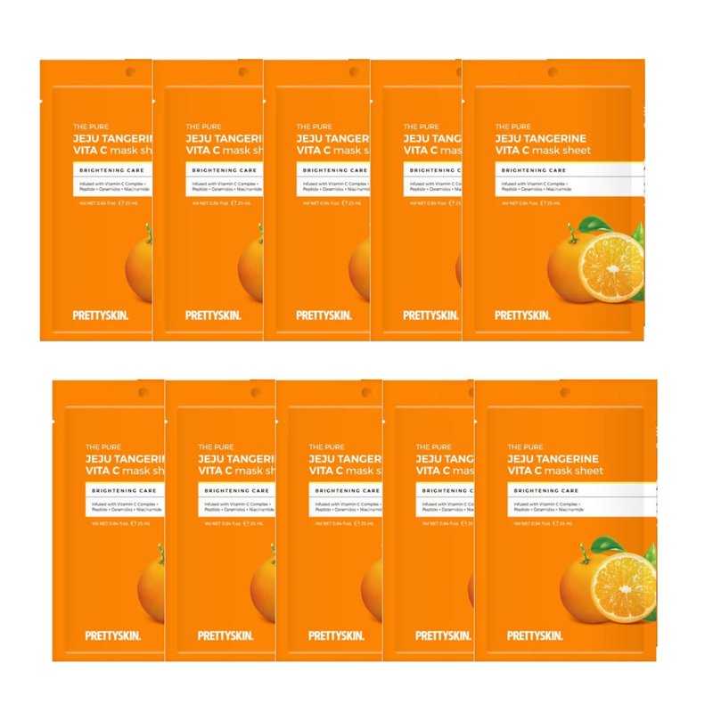 PS.PRETTYSKIN Jeju Tangerine Vitamin C Facial Mask Sheet (Pack of 10) with Panthenol + Adenosine + Niacinamide for Moisturizing, Soothing, Korean skincare