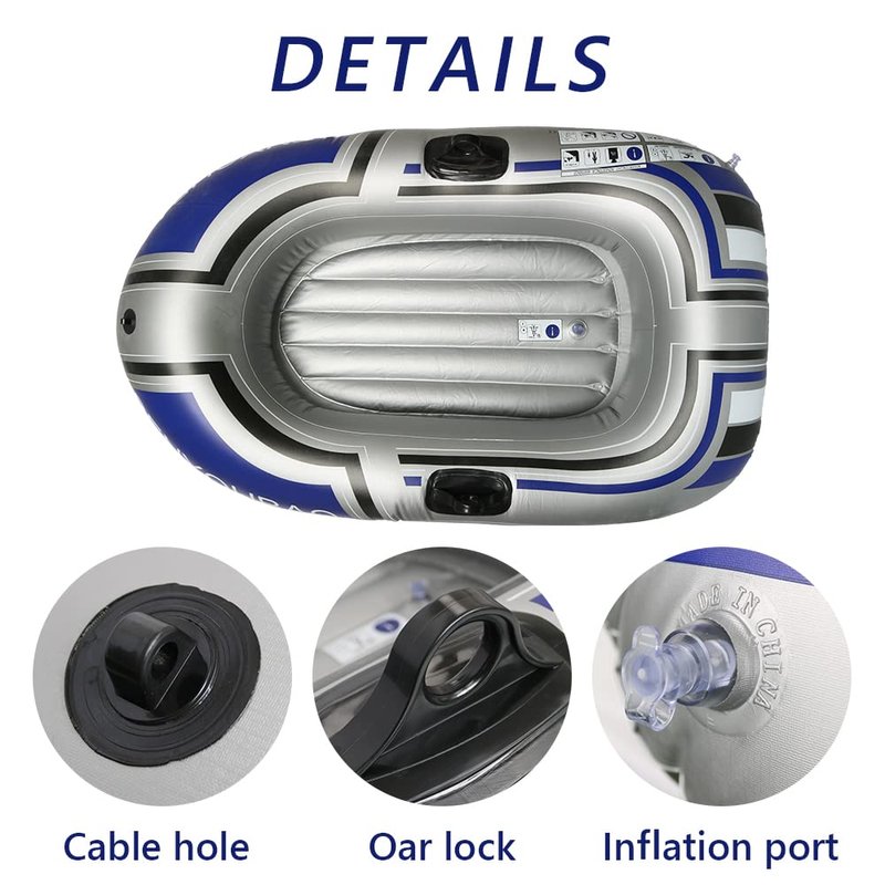 - 2 independent air chambers for safety; oar locks on both sides; grab the rope to dock.