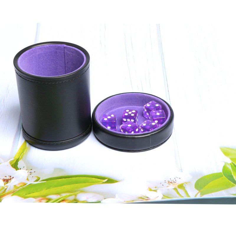 PU Leather Dice Cup Purple Velvet Lined Quiet Shaker with Lid Including 6 Purple Translucent Dice for Liars Dice Farkle Yahtzee Board Games