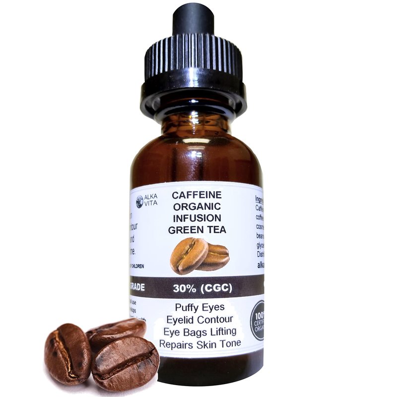 CAFFEINE 30% HERBAL INFUSION Eyelid Bags Under Eyes Reducer Skin Serum Original Organic Coffee & Green Tea Beans / Bottle Dropper 1 fl oz (30 ml) CAFFEINE BENEFITS: Caffeine is soothing, anti-inflammatory and vasoconstrictive, which can decrease redness and puffiness, explains certified clinical and Dermatologist researches. By narrowing blood vessels and calming skin, caffeine can reduce under-eye bags. Caffeine is an antioxidant, and when antioxidants are included in eye serums, these formulas can help protect against damage and keep your eye area looking its best. PRODUCT BRAND: ALKA VITA / DIRECTIONS: Apply infusion on eyes contour by morning and before bed time. Unisex use for all type of skin. INGREDIENTS: Caffeine premium organic coffee concentrate (30%), green tea beans, liquid silica & vegan glycerin. (KEEP IT REFRIGERATED AFTER OPENED). Our products are made with the best quality ingredients, pure and original. EXP: 1 year after opened. CAUTION: Cosmetic grade for external use only, if irritation develops discontinue use. If contact with eyes occurs flush with water. KEEP OUT OF REACH OF CHILDREN / PRODUCT MADE IN USA