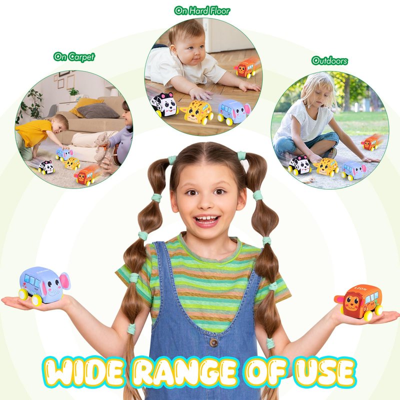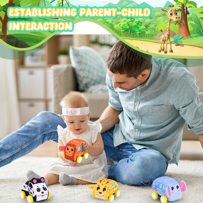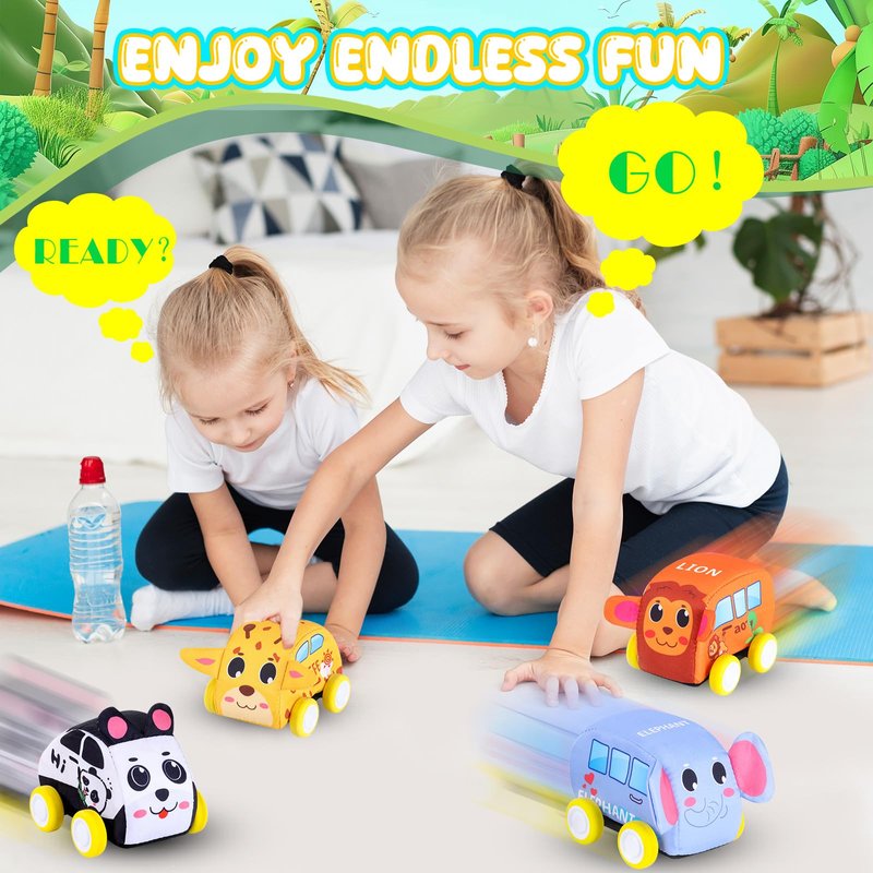SAFE TODDLERS TOY CARS: This soft car toys set for 1-3 year old boy is designed with soft fabric and stuffing sponge. 100% safe and Eco-friendly, BPA Free, non-toxic materials and without small parts. The soft toddler toys car set with mat provides a safe and fun playing spot for toddlers. The soft part is removable for easy cleaning. EASY TO USE: The rev-up mechanism inside each vehicle makes it easy for babies and toddlers to get big acceleration with little input; they just pull them back and release to see them zoom off across the floor. PROMOTES MULTIPLE SKILL DEVELOPMENT: Our car toys for babies and toddlers help to develop multiple skills, including sensory, fine motor, gross motor, and, communication. COLORFUL AND CUTE: 4 Cute animals: giraffes, lions, pandas, elephants. Bright colors and amazing design. PERFECT GIFT FOR TODDLERS AND BABIES: Long-lasting and lightweight. Nice gift package, perfect for kids' birthday gift, Christmas gift and early education toys.