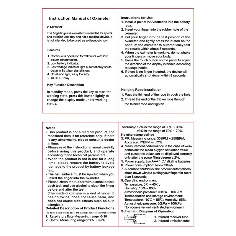- 【Portable and durable】Oximeter with rechargeable, oximeter with lanyard, light weight, portable and durable. This device is for sports or aviation use only and should not be used for medical purposes.