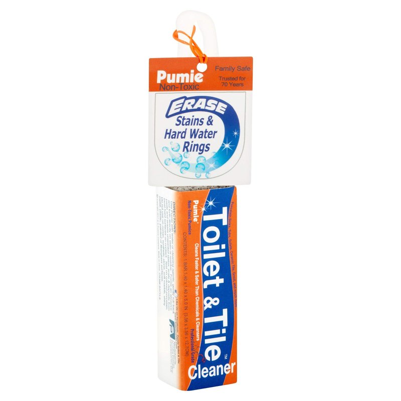 - ERASES TOILET BOWL RINGS IN SECONDS. CLEANS WHERE CHEMICALS FAIL: Pumie works through gentle abrasive action. Scours away mineral deposits, rust, stains and scale from toilets, sinks, tubs and showers. Removes unsightly toilet rings