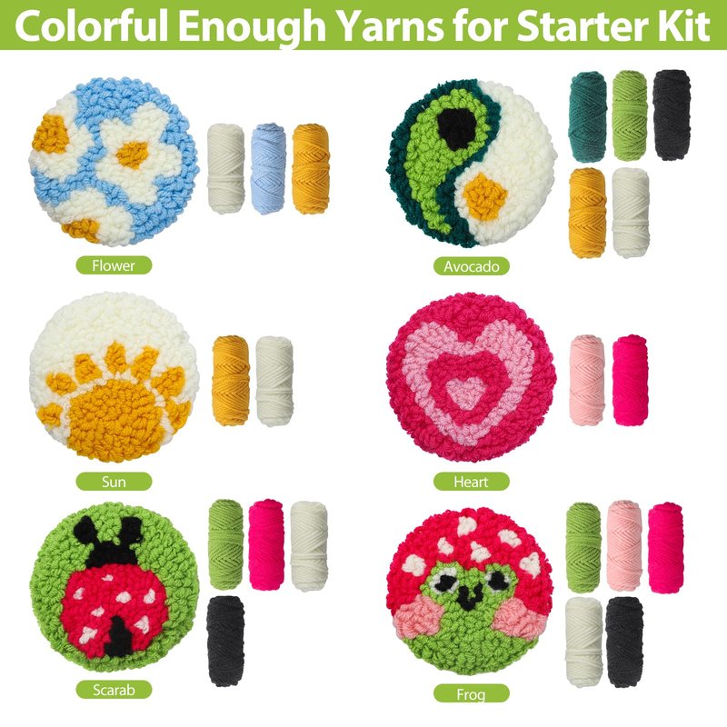 Package Contains 19pcs Enough colors cotton yarns 6pcs Punch needle cloths with flower,Frog,Heart,Sun,Scarab,Avocado patterns 6pcs Adhesive felts 6pcs Punch needle tool 1pc Sewing thread 1pc Embroidery hoop 1Sheet Instruction
