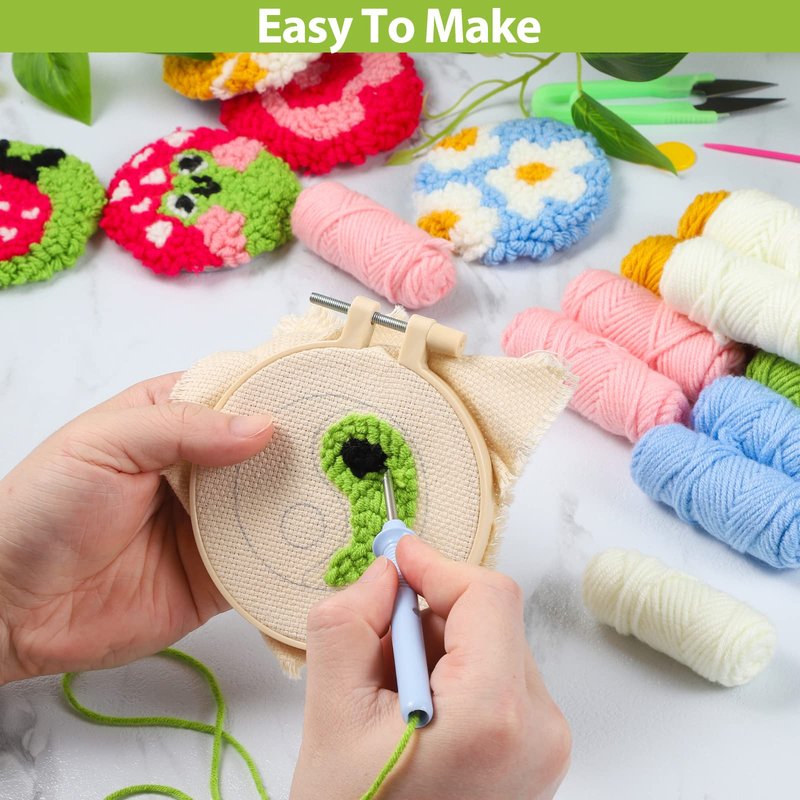 - 【Punch needle coasters kit for kids beginners】The punch needle kit for beginners contain 6pcs cloths with patterns, 6pcs adhesive felts, 1set enough colors cotton yarns, 1pc embroidery hoop, 1pc sewing thread,6pcs handle tools and 1 instruction, totally 22 pieces;The punch needle kits comes with everything you need to create beautiful coasters using a punch embroidery kit technique. The instructions are clear and easy to follow, even if you're new to the craft.