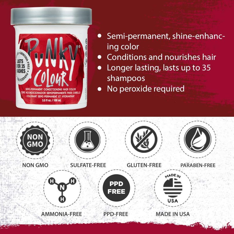 Punky Vermillion Red Semi Permanent Conditioning Hair Color, Vegan, PPD and Paraben Free, lasts up to 25 washes, 3.5oz Brings Back Life To Your Hair This semi-permanent toning cream from Punky Colour will help protect your hair color from fading. It repairs your hair from root to tip, prevents frizz, and adds shine to your locks with every use. It also polishes dull hair, prevents fading, and enhances the vibrancy of your hair color all at once, making your hair color look brighter and more intense! This also works well to rebuild the bonds deep in the core of hair fibers for multiple times stronger and silkier hair instantly after application!  No More Regular Salon Touch-Ups You won’t have to keep returning to the salon for touch-ups on your hair color. When you think about it, this semi-permanent hair colorant  is a great buy for the money. The few dollars more than you spend is worth it when you consider the money you’ll be saving by using a good salon brand color dyeing cream just like Punky Colour!  Crafted With Hair-Friendly, Safe Ingredients This hair coloring agent from Punky Colour is free from Paraben, PPD, and is completely vegan and cruelty-free. Recommended by hair professionals, this hue colorant is the ultimate in dyeing and color protection for all types of hair! It's a great way to infuse fun into your look without the commitment. It also works well as a color overlay or a lowlight. Amp up your shade while softening strands to keep your hair looking beautiful and healthy!