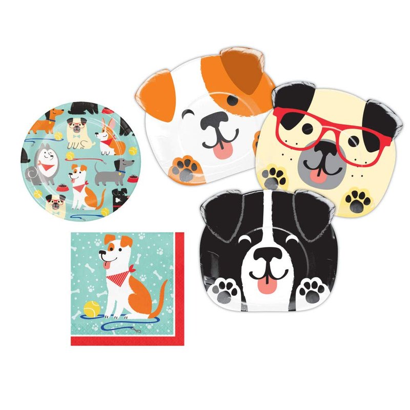 Puppy Paws Dog Themed Party Supplies for 8 Guests Includes: (8) 9 inch Assorted Dog Shaped Dinner Plates in 3 different designs, (8) 6 7/8 inch Dessert Plates (16) Luncheon Napkins. Items feature various pups eagerly waiting to play "fetch". The design is cute and fun featuring cartoon-ish dogs against a mint and red color scheme. If your child loves puppies, this party bundle will make his or her birthday just pawfect! Clean up is a breeze with this adorable party set.