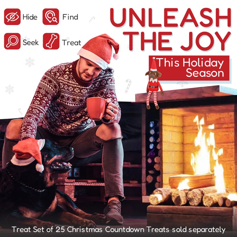 Give your furry friend a holiday experience like no other with Pooch on a Perch, the interactive holiday dog toy that sparks joy every morning! Start a fun new Christmas tradition with your dog through a game of "hide, seek, treat." Each night, hide the toy for your pup to find in the morning and reward them with a treat, creating a magical, interactive holiday routine. Perfect for the whole family, Pooch on a Perch turns your dog into part of your Christmas celebration, alongside Santa, reindeer, and all the festive fun! Whether this pup sits on the shelf or on a perch, it's sure to a be a favorite christmas gift and tradition. Get ready for endless holiday cheer with Pooch on a Perch! This cute dog toy is the perfect addition to your collection of Christmas dog toys. Modeled after a mischievous holiday elf, this funny dog toy is designed to be hidden around your home, letting your dog engage in a daily game of hide-and-seek. Each morning, your pup will search for their beloved toy and be rewarded with delicious Christmas dog biscuits or their favorite treats. With a built-in squeaker and kris krinkle crinkle paper, Pooch on a Perch will keep your dog engaged while also spreading festive fun. It's not just another dog toy that squeaks – it’s a delightful new tradition for the holiday season! Even Santa and his reindeer will be envious of your holiday cheer. Whether your dog loves to chew, fetch, or snuggle, Pooch on a Perch is perfect for every occasion. Pair with Pooch on a Perch Treats, a pack of 25 mini, handmade treats from organic ingredients—one for each day in December, leading up to a special iced cookie for Christmas morning. These festive goodies as dog xmas gifts are the perfect way to reward your pup throughout the holiday season! Don’t be a Grinch and start a new family tradition with your pup this year!