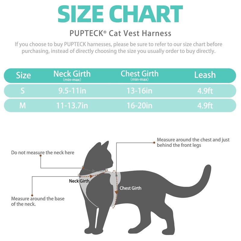 - Harness & Leash Set for Average Cat: [S - Neck Girth 9.5"-11", Chest Girth 13"-16"]; [M - Neck Girth 11"-13.7", Chest Girth 16"-20"]. Please measure your four-legged friends and refer to the size chart carefully before purchasing. Package includes 1x cat walking harness and 1x long cat leash(4.9ft).