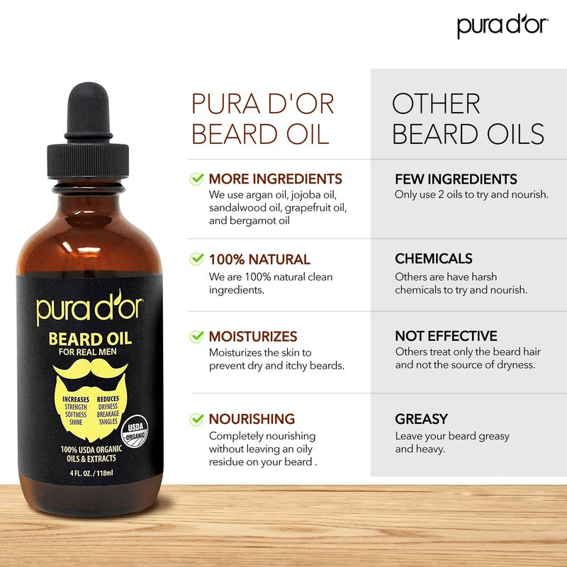 - STOP THE BEARDRUFF: Beardruff happens when the beard isn't moisturized enough. PURA D’OR oil for beard acts as anti-beardruff. No more funny business. Look like a million bucks.