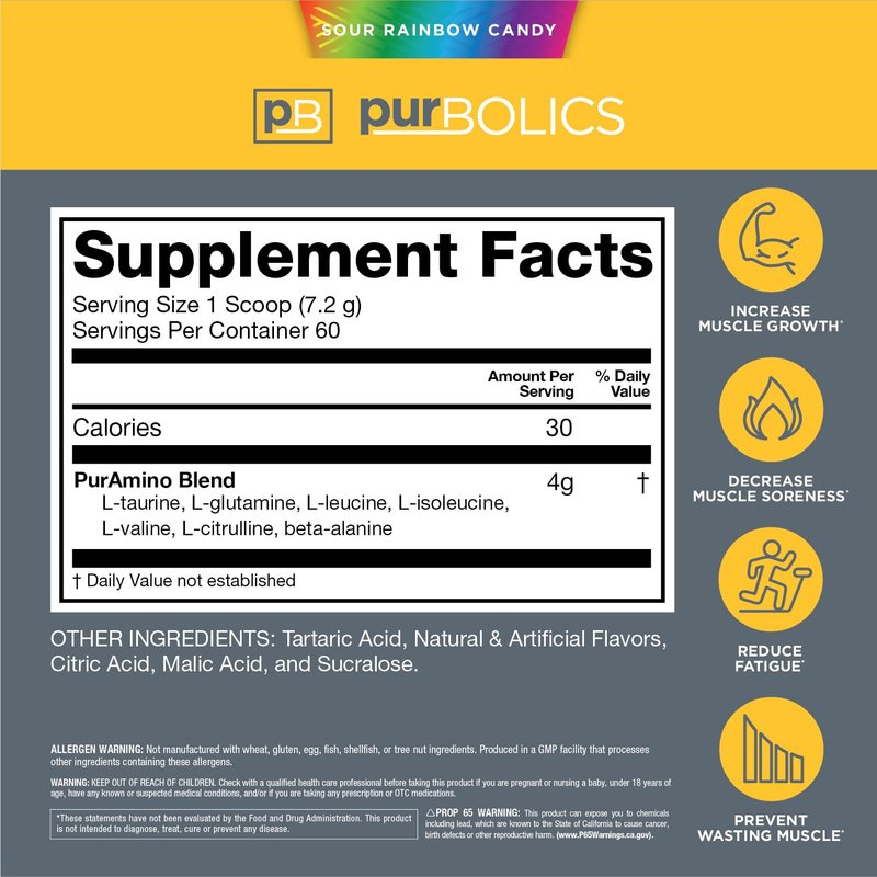Purbolics Aminos | 4g of Free-Form Amino Acids, Beta-Alanine, 0 Sugar & 60 Servings (Sour Rainbow Candy)