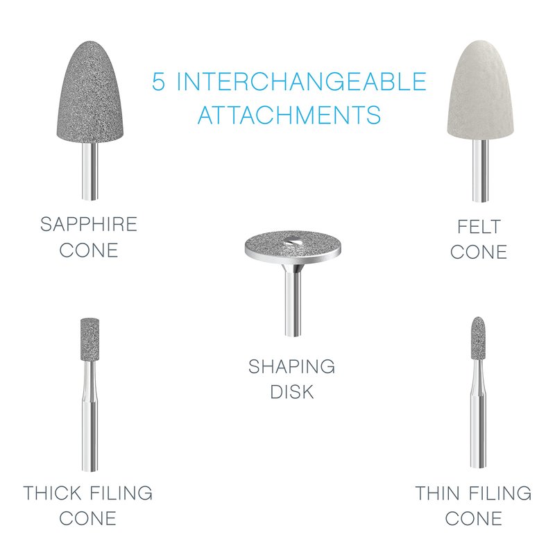 - 5 Interchangeable Attachments: Includes a sapphire shaping disc, sapphire cone, thick filing cone, thin filing cone, and a felt cone for buffing nails to a shine