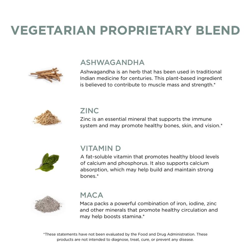 - VEGETARIAN PROPRIETARY BLEND: Helps stimulate your body's ability to retain muscle, making it easier to achieve your gym goals. Fuel your daily performance with our proprietary blend of key ingredients like Ashwagandha, Zinc, Vitamin D, Maca, and Tongkat Ali.*