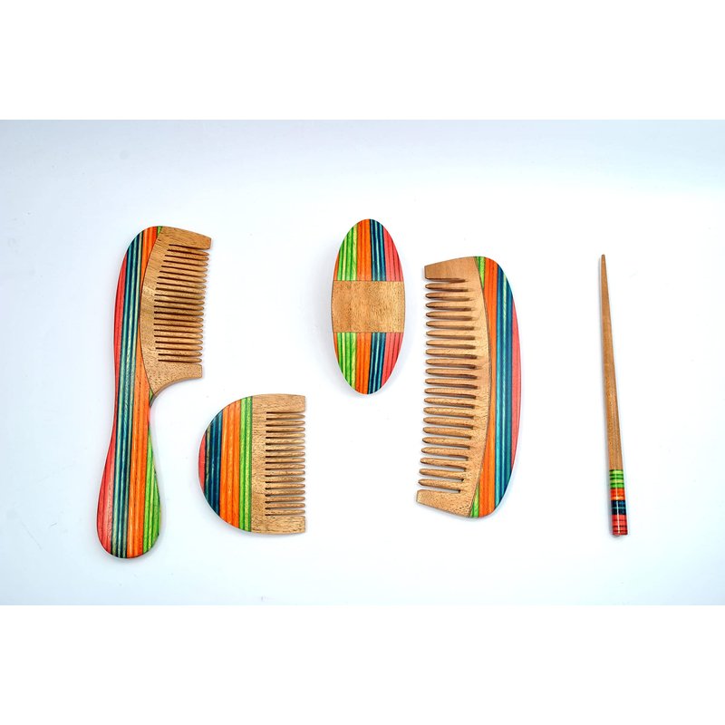 Radiant Rainbow is a handmade set of Hair Accessories. Wooden-comb, Pocket Comb, Comb, Hair Clip, and Hair Stick for-women are made with Natural Organic Neem Wood in Multi-Color Rainbow Combination.