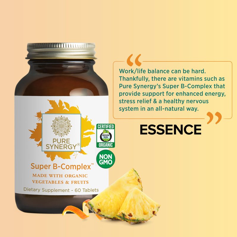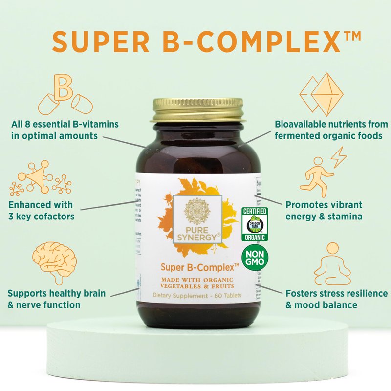 PURE SYNERGY Super B-Complex | Vitamin B Complex Made with Organic Whole Foods | Vegan Supplement with Natural Vitamin B12, Niacin, and Folate | for Energy, Focus and Mood Support (60 Tablets)