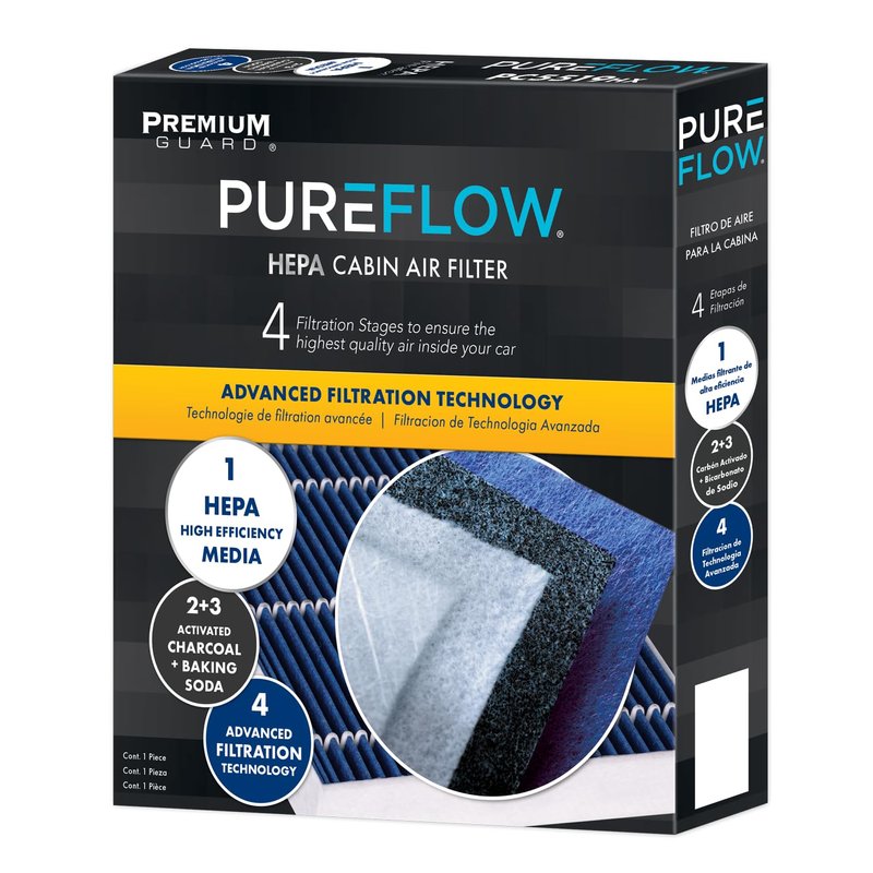 - BREATHE BETTER AIR. PUREFLOW HEPA by Premium Guard cleans with 4 filtration levels. For drivers and passengers who suffer from severe allergies, PUREFLOW HEPA (High Efficiency Particulate Air) offers 99.97% efficiency, capturing microscopic pollutants including pollen and other allergens (may result in a minor restriction to airflow).