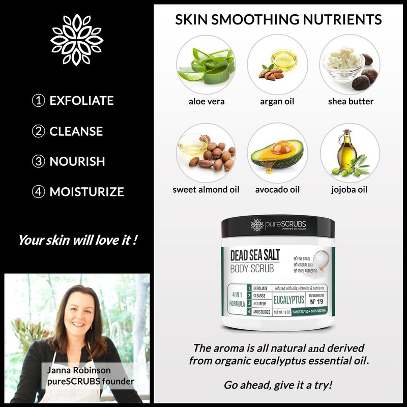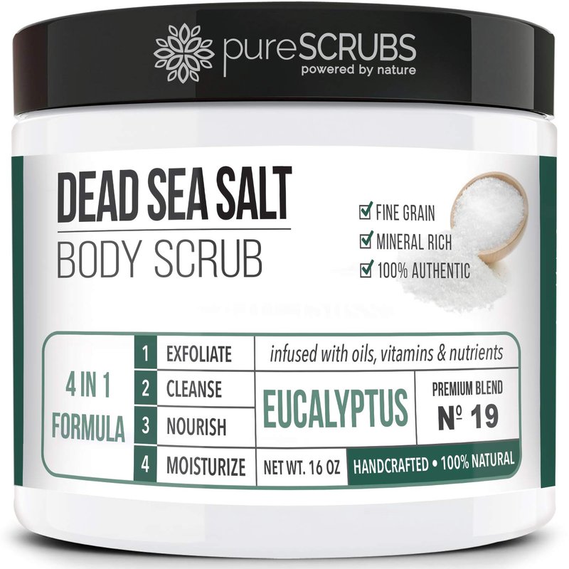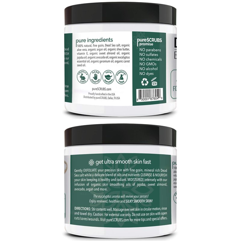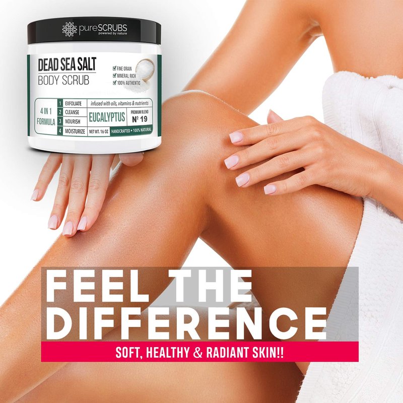 - 💚 GET ULTRA SMOOTH SKIN FAST - THIS WORKS! Our unique “4 in 1 Formula” does everything a body scrub should do and more - EXFOLIATE, CLEANSE, NOURISH & MOISTURIZE. Fine grain dead sea salt infused with organic essential oils, nutrients and skin softeners will transform your skin making it soft, healthy and radiant. Helps reduce appearance of cellulite, stretch marks, dark spots & acne scars. Great for ashy elbows and knees. Ingrown hairs don't stand a chance! You'll love the eucalyptus aroma!