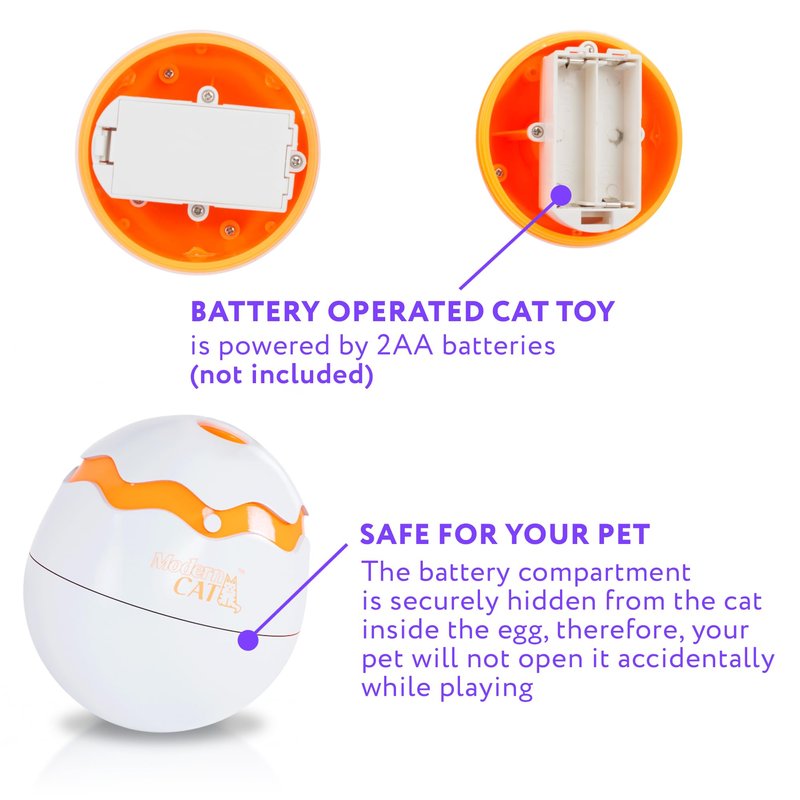 - Easy to Set Up and Use. This battery operated cat toy runs on 2 AA batteries (not included). Just insert the batteries, turn it on and watch your cat have fun. The battery compartment is securely hidden inside the cat egg toy, so your pet can't accidentally open it while playing. 15-minute automatic shut-off makes play exciting and unpredictable.