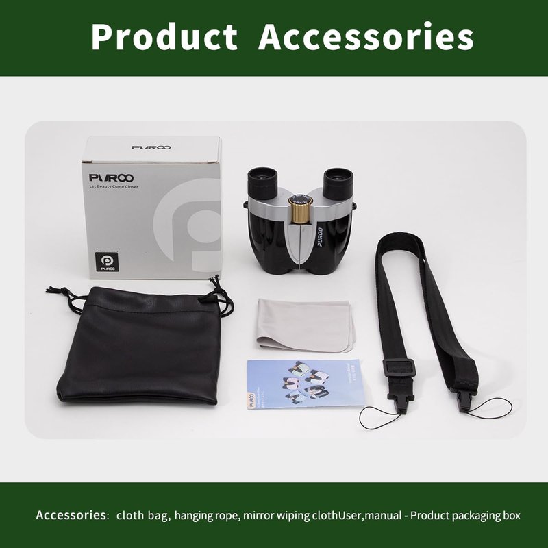 - 【High-definition Experience】With 10 years of expertise in production, PUROO binoculars offer high-quality optics. They are easy to use for both adults and children, featuring simple focusing and a unique right eye diopter compensation function for clear and comfortable viewing. Accessories such as a carrying case, neck strap, lens cleaning cloth, and user manual ensure easy everyday use and maintenance.