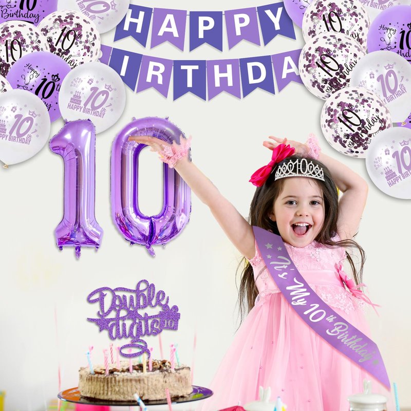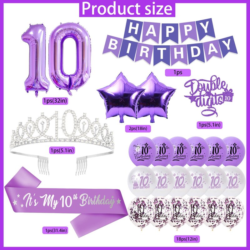 - 10th Birthday Party Must Have: The box includes: 1 pcs x silver 10th birthday rhinestone crown; 1 pcs x purple “HAPPY BIRTHDAY”banner; 1 pcs x double digits cake topper; 1 pcs x lavender "It’s my 10th Birthday" sash; 1 pcs x 32inch purple number "10" foil balloon; 2 pcs x 18inch star foil balloons; 18 pcs x 12inch 10th happy birthday latex balloons, which can meet your groovy 10th birthday party decoration needs