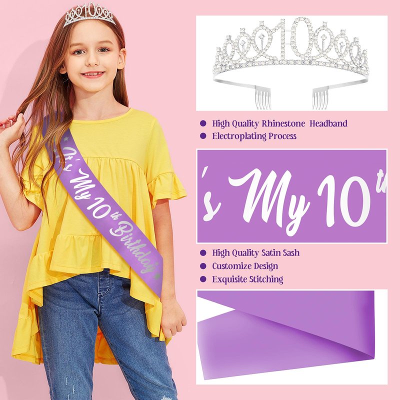 - 10th Birthday Gifts for Girls: This is the most important day of your daughter's year, make your girl special and dazzling on this special day with the rhinestone crown and purple birthday sash; purple pretty banner and lots of balloons creating romantic atmosphere and perfect props for taking pictures