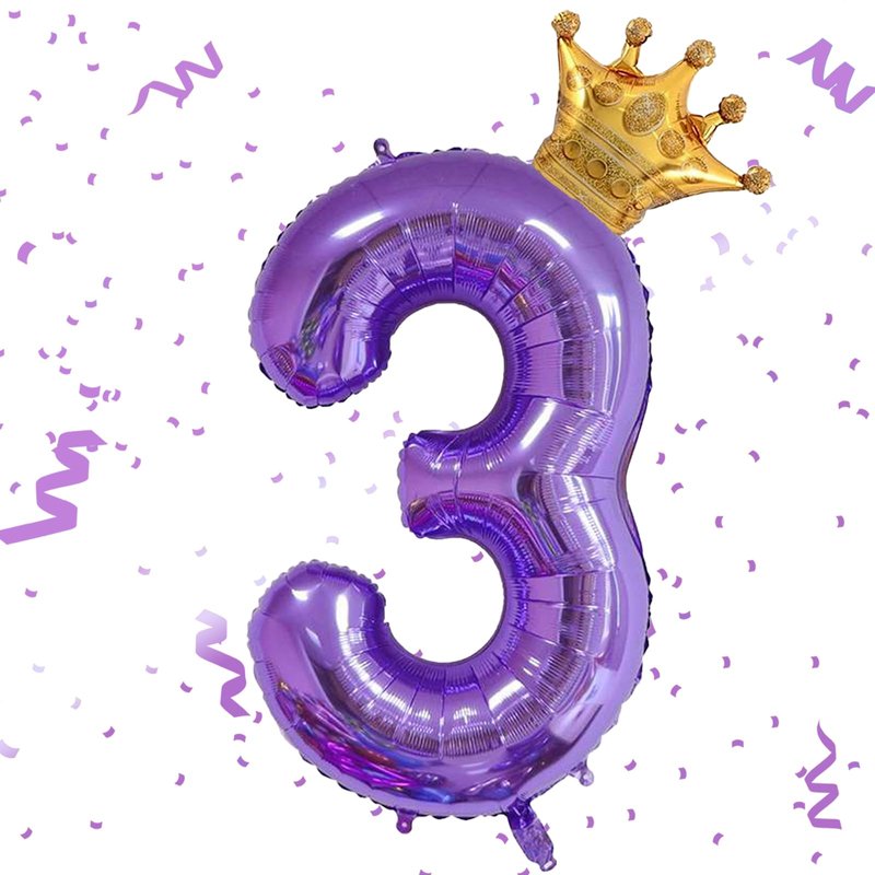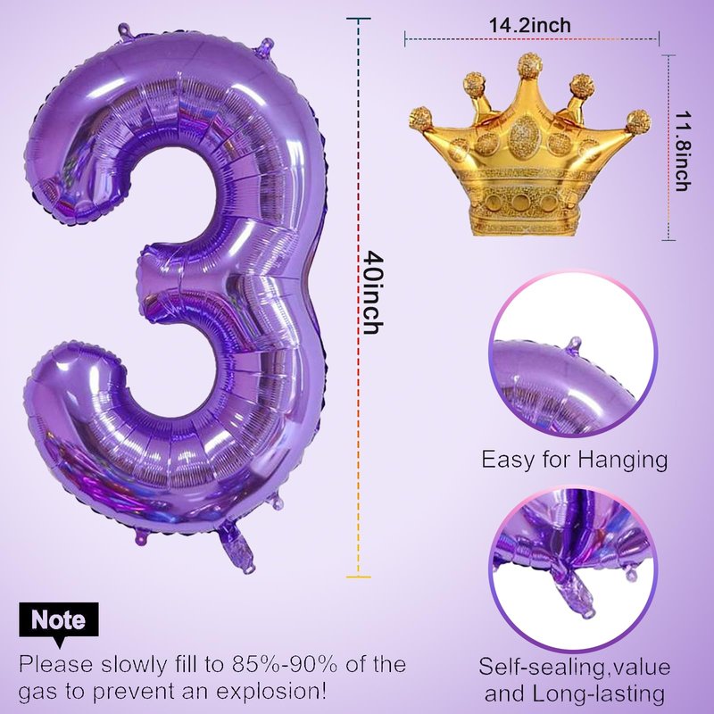 Purple 3 Balloon 40 Inch,Giant Number 3 Balloon & Mini Crown Balloon Set for Girl Boy 3rd Birthday Party Decorations,Purple Birthday Party Decorations Supplies Birthday Digital Balloon