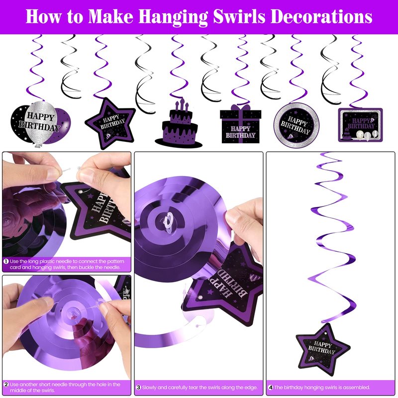 - 💜DIY Your Birthday Party - This purple birthday party decorations need a DIY by yourself. Many kinds of birthday elements to meet your decoration needs! Hanging these purple fringe curtains, HAPPY BBIRTHDAY banner, pennant banner flag and hanging swirls on the wall, window, door, garden or anywhere you want, to make your unique birthday party scene. Just enjoy the happy family craft time with no hassle! It is best to start this project 30mins in advance.