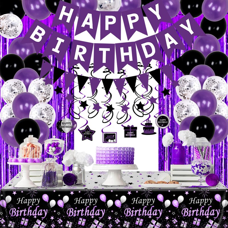 Purple Black Birthday Decorations for Women Girls, Happy Birthday Party Decorations for Her Him Bday Party Supplies Balloons Tablecloth Foil Fringe Curtains Hanging Swirls Decor Pennant Flag