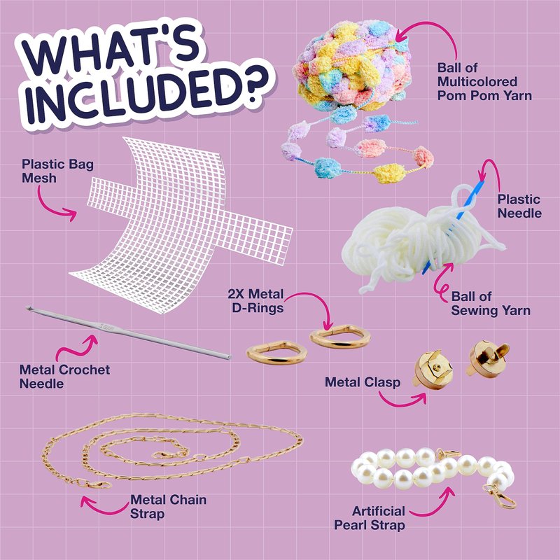 - A COMPLETE CRAFT KIT FOR TEENS AND TWEENS - Our Craft-Your-Own Pompom Bag includes everything you need to decorate your own bag for girls, including a ball of multicolored pompom yarn, plastic bag mesh, a metal chain strap, an artificial pearl strap, a plastic needle, a ball of sewing yarn, a metal crochet needle, metal magnetic clasps and full step-by-step instructions.