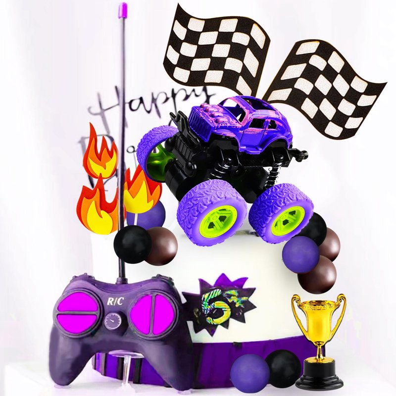 - Monster Truck Cake Decorations:This set includes 1 Xpurple monster truck toy car, 1 Xtrophy, 1X pack of flame decorations, 2 X plastic stick chevron flags, 15X foam balls (5X purple, 5 Xblack, 5Xdark brown) perfect for creating exciting cake or cupcake displays!