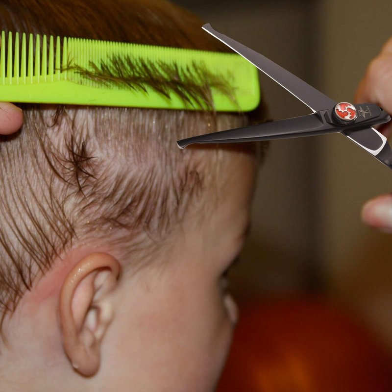 - PREMIUM MATERIAL - Black Top-quality Japanese 440C stainless steel Right Handed Hair Cutting Shears can be opened and closed about 150,000 times in theory and are tempered with Hand-sharpened cutting edges and Precise, Convex edge, Hollow-ground, extremely sharp cutting blades. The barber shears can evenly trim hair without damaging or splitting hair ends, perfect for hair styling, making children's hair more beautiful and natural.