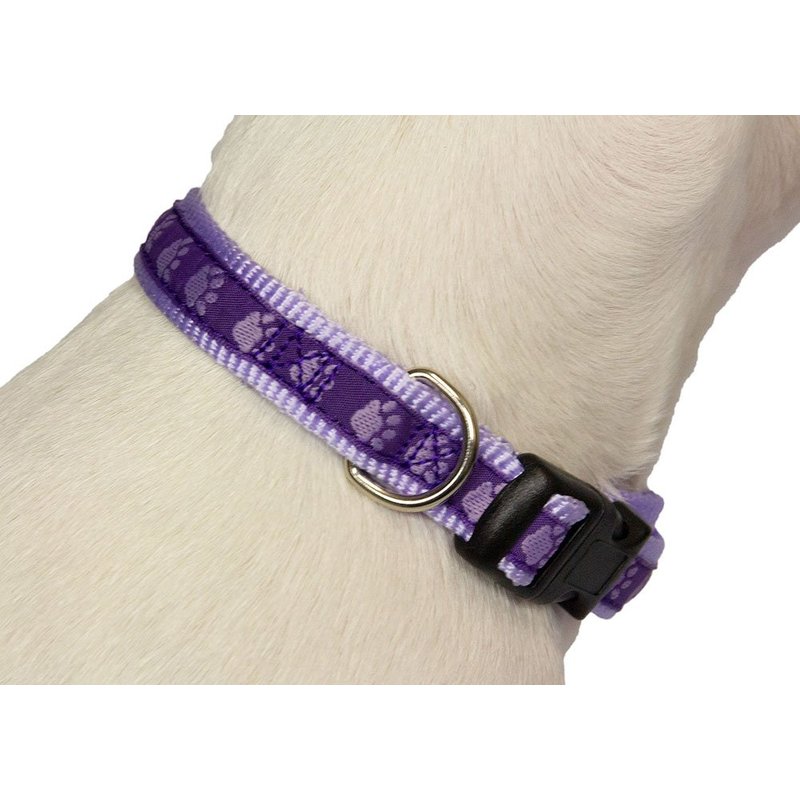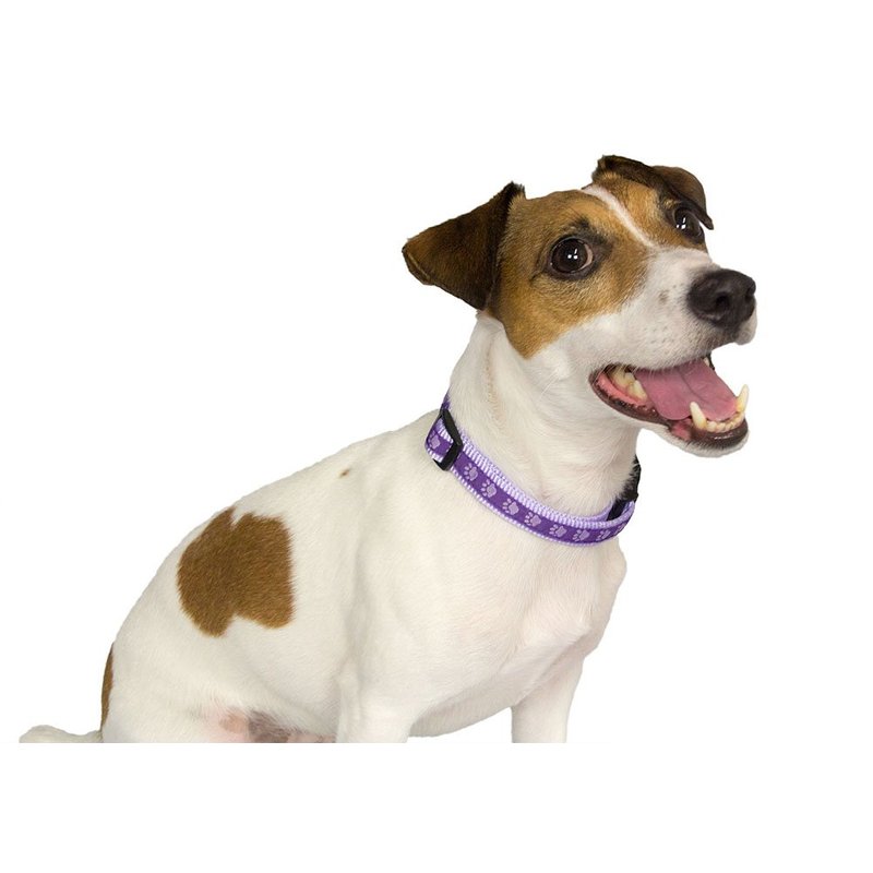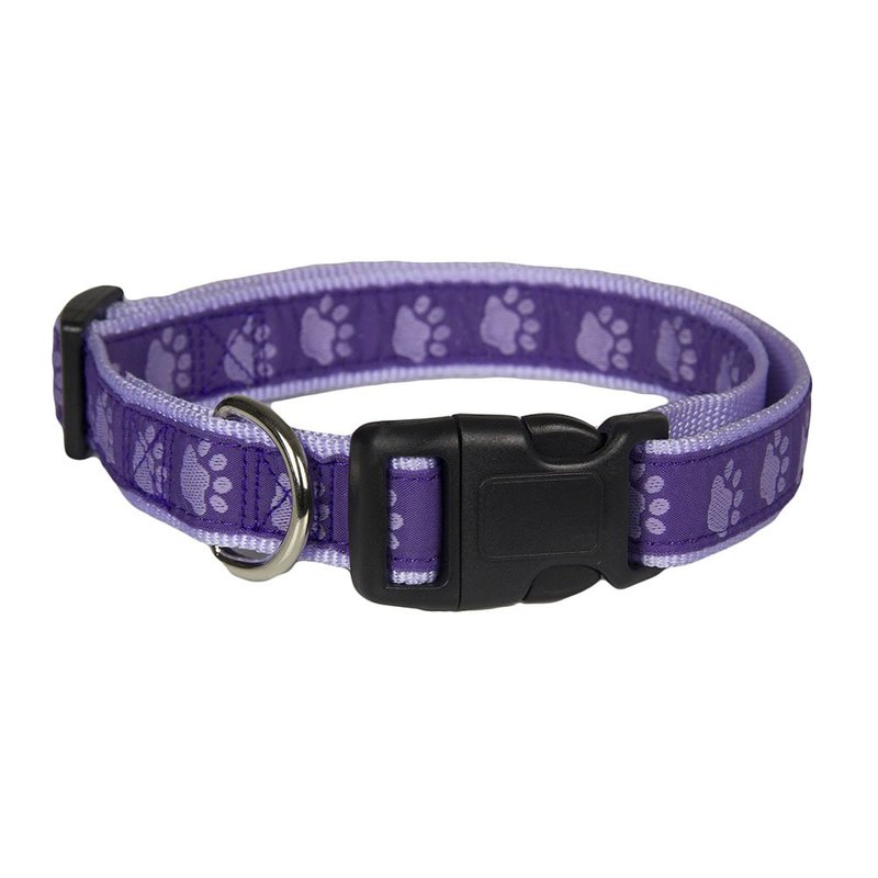 This dog collar is a great choice for any dog. Its purple color and paw print design will add style and the durable nylon construction ensures a long life. See the sizing guide below to get the correct collar for your purple dog! Sizing Guide To determine the proper size, measure the circumference of dog's neck and add 2"