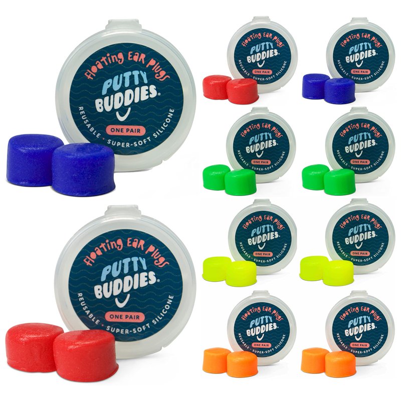 The assorted color option consists of 2 blue, 2 red, 2 green, 2 yellow, 2 orange. Putty Buddies are soft moldable silicone earplugs perfect for swimming and bathing. They are very easy to use and mold to the ear. These Putty Buddies ear plugs are made with our special, patented Flo-Tek silicone formula. They float easily on water so they can always be found if dropped or dislodged! THE WORLD’S ONLY FLOATING SOFT MOLDABLE SILICONE EARPLUGS! Putty Buddies feature a super soft silicone which are much more soft and comfortable than other earplugs. They are also extra tacky which keep earplugs in place for maximum effectiveness. Invented by an Ear, Nose, Throat Physician and recommended by doctors worldwide. HELPS PREVENT SWIMMER’S EAR. GUARANTEED EAR PROTECTION. Block water from the ear canal! Great for swimming, bathing, surfing, water skiing, canoeing, and kayaking. Perfect for traveling to the pool, lake or beach. For maximum protection earplugs should be worn with the Ear Band-It or Ear Band-It Ultra swimming headband. HOW TO USE PUTTY BUDDIES silicone earplugs: DO NOT INSERT INTO EAR CANAL. Plugs should be applied by an adult, never a child. Flatten plugs with fingers & shape to cover outer ear until snugly fit. DO NOT tear plugs at any time. Use entire plug for each ear. DO NOT FORCE INTO EAR CANAL. Remove plugs by pressing up under the backside of the ear and pulling down on the ear lobe. Alternating these techniques several times will release the plug over the ear canal for easy removal. Plugs may be used for up to 2 weeks with proper handling. Discard & do not use if plugs become dirty, lose their tackiness, or begin to crack/crumble. Apply, use, and remove with adult supervision. Ear plugs are for use ONLY in water. If the user is out of the water for more than 5 minutes, please remove ear plugs, store and reapply (or use new pair) when re-entering the water.