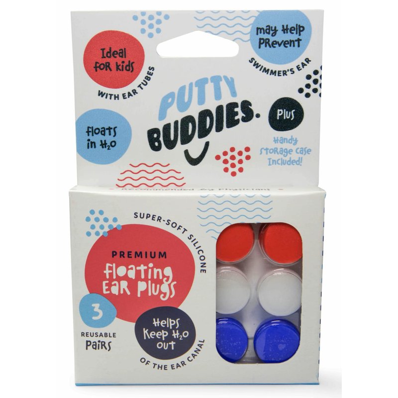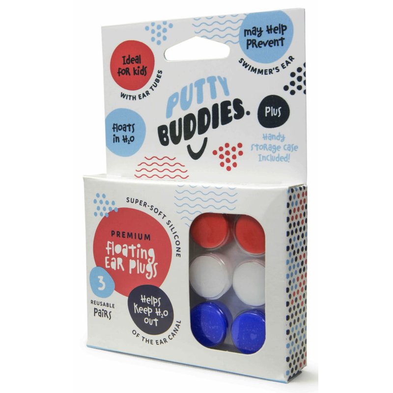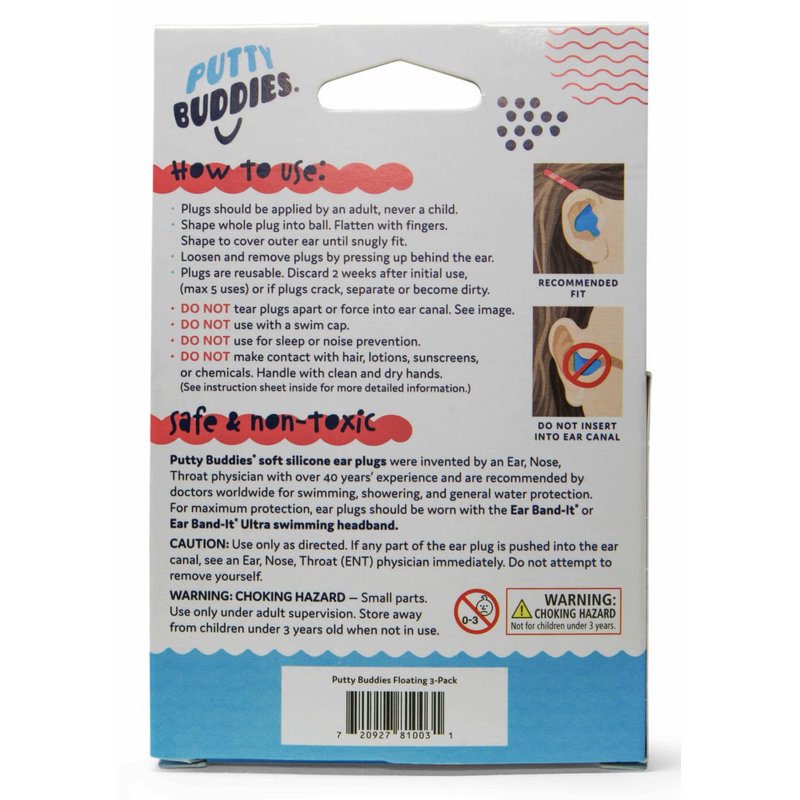Putty Buddies are soft moldable silicone earplugs perfect for swimming and bathing. They are very easy to use and mold to the ear. These Putty Buddies ear plugs are made with our special, patented Flo-Tek silicone formula. They float easily on water so they can always be found if dropped or dislodged! THE WORLD’S ONLY FLOATING SOFT MOLDABLE SILICONE EARPLUGS! Putty Buddies feature a super soft silicone which are much more soft and comfortable than other earplugs. They are also extra tacky which keep earplugs in place for maximum effectiveness. Invented by an Ear, Nose, Throat Physician and recommended by doctors worldwide. HELPS PREVENT SWIMMER’S EAR. Large enough for adults. GUARANTEED EAR PROTECTION. Block water from the ear canal! Great for swimming, bathing, surfing, water skiing, canoeing, and kayaking. Perfect for traveling to the pool, lake or beach. For maximum protection earplugs should be worn with the Ear Band-It or Ear Band-It Ultra swimming headband. HOW TO USE PUTTY BUDDIES silicone earplugs: DO NOT INSERT INTO EAR CANAL. Do not tear plugs at any time. Use the entire ear plug for each ear. If plug appears to separate or crack, please do not use or attempt to remold together. Discard and use a new pair. Shape into a ball and place over clean, dry ear canal. Flatten plug with finger and shape to cover outer ear until snugly fit. DO NOT FORCE INTO EAR CANAL. Remove plugs by pressing up on back of the ear. Discard after 2 weeks of use or when dirty. Apply, use, and remove with adult supervision.