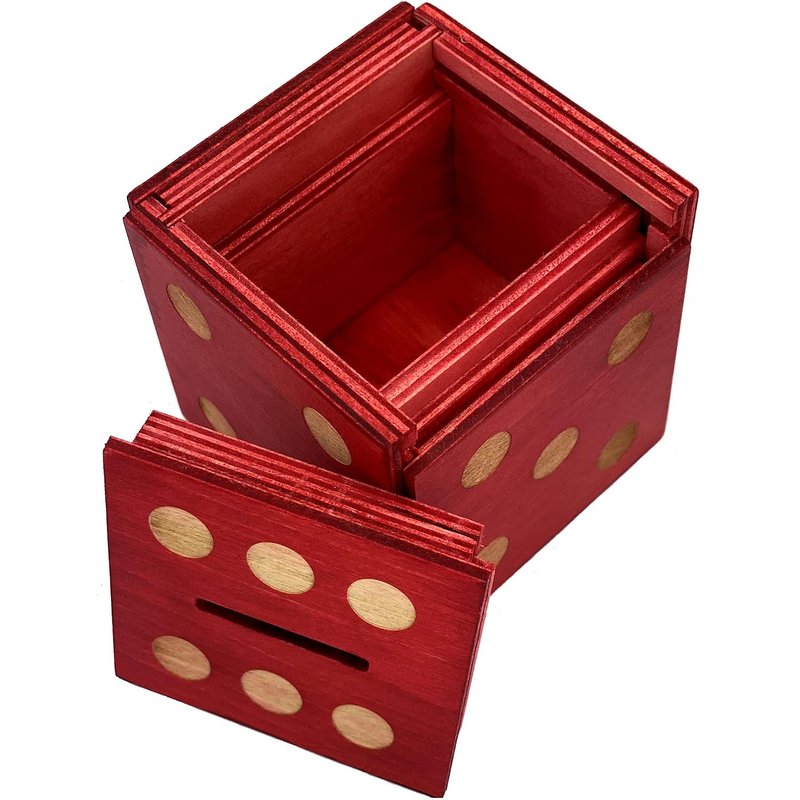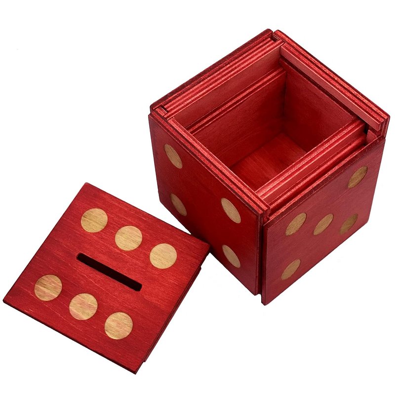 Puzzle Box Enigma Dice Cube - Money and Gift Holder in a Wooden Magic Trick Lock with Hidden Compartment Piggy Bank Brain Teaser Game (Red)
