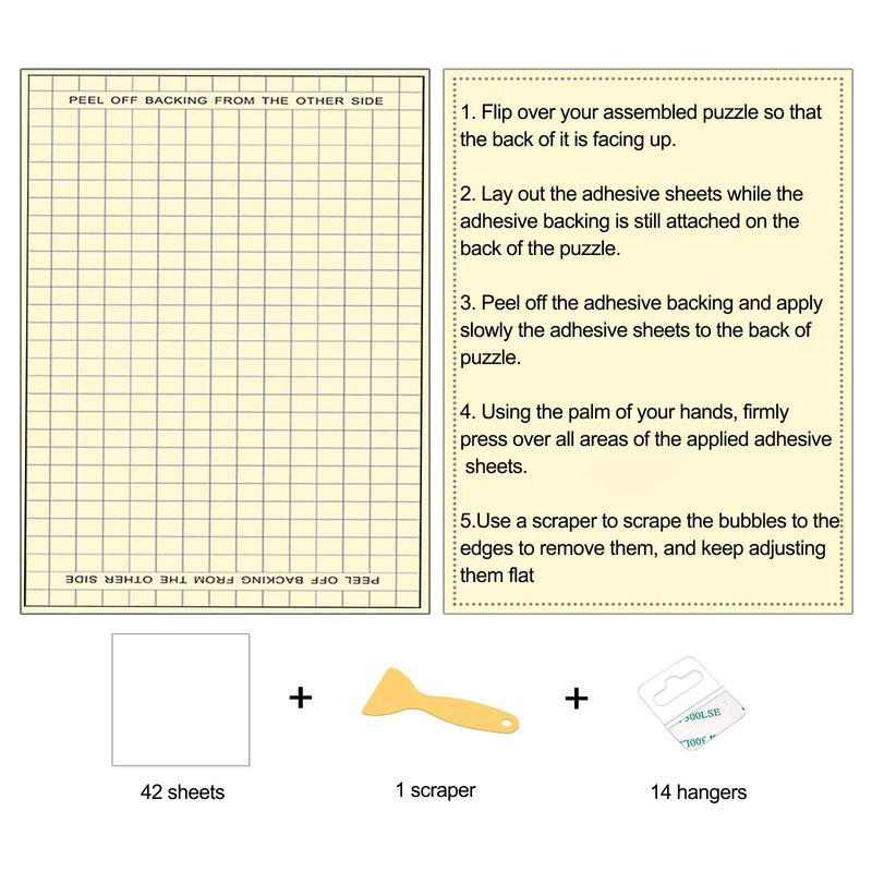 - 【Puzzle Accessories】Puzzle Glue Sheets for saving 7 x 1000 pieces puzzle could be stuck to the backside of your puzzle so that your puzzle will not spread out. Scraper could help you remove bubbles between puzzle and adhesive sheet better. Adhesive hangers could help you hang your puzzles.