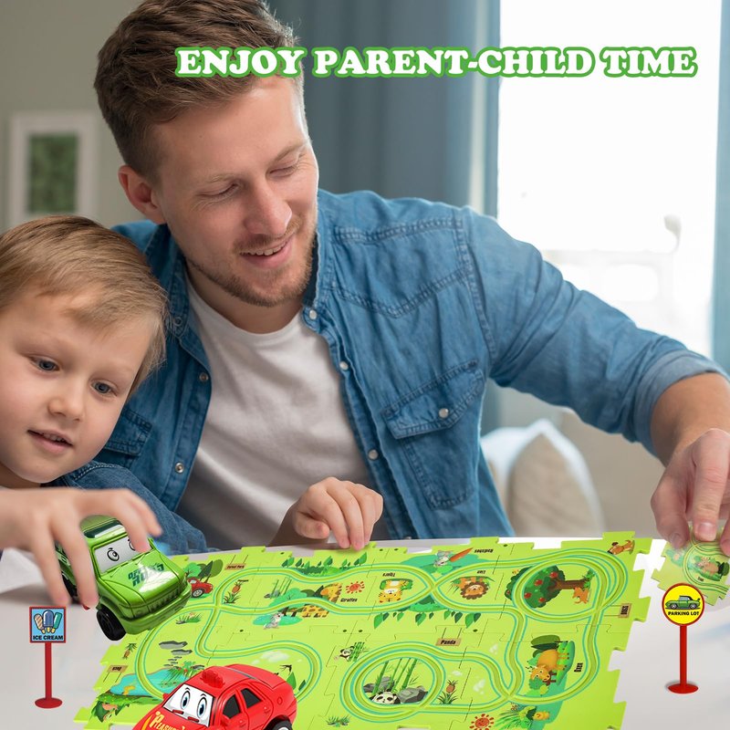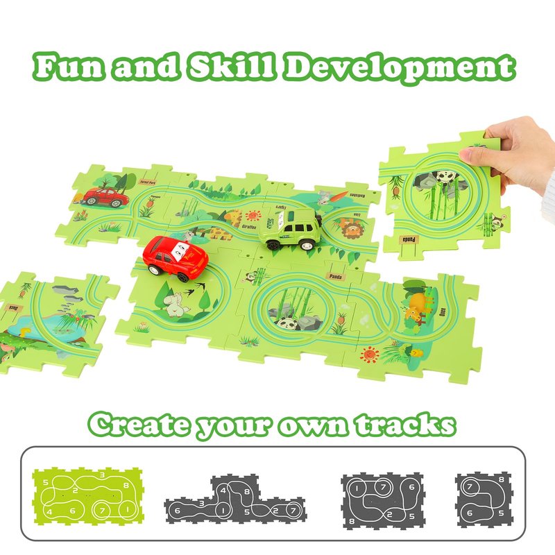- Children's Educational Track Car Set - This puzzle track plane play set Includes 8 pcs puzzles and 2 cute electric cars (1*AAA battery required but batteries not included), the puzzles can be easy to assemble into different tracks for the electric little cars to run around
